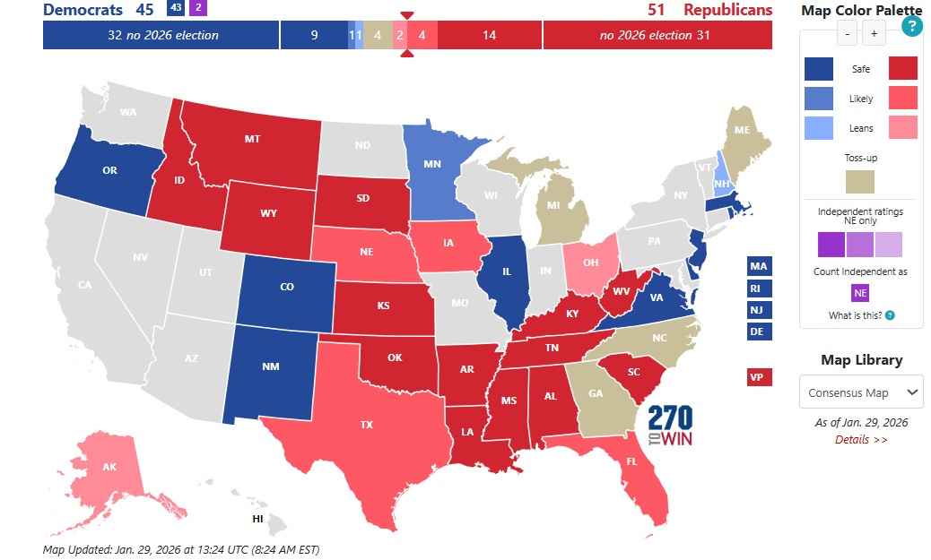 Minnesota skulle være trygg etter ICE-fremferden der, selv om partiet må finne en erstatter for Tina Smith som ikke tar gjenvalg. Deres andre senator, Amy Klobuchar, stiller i guvernørvalget, og hennes eventuelle erstatter vil bli midlertidig utnevnt av den nye guvernøren. Taper demokratene Minnesota har de tapt senatet, ganske enkelt.
