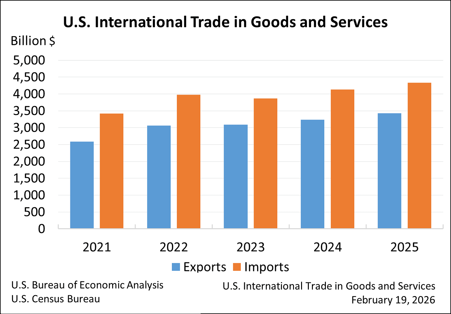 Her må resultatene ses over lengre tid, ikke over enkeltmåneder. Tidligere i uken fikk vi fasiten for 2025. Samlet underskudd ble nesten nøyaktig det samme som i 2024. Underskuddet i varehandelen – altså det tollen primært rammer, økte litt. Men tjenestebalansen, der USA har betydelig overskudd, beveget seg ytterligere i den retningen.