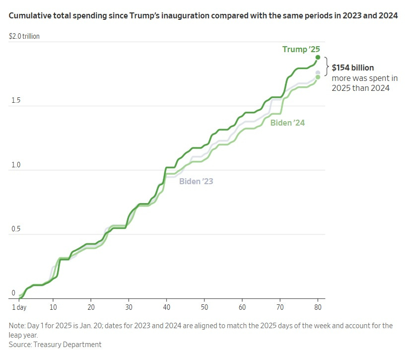 En annen tilnærming er å se på hvor mye penger føderale myndigheter rent faktisk bruker. Finansdepartementet offentliggjør dette daglig, og Wall Street Journal har en nyttig gjennomgang i dag. Hovedfunnet er vist i figuren. Som vi ser fortsetter utgiftene å øke, de øker betydelig mer enn inflasjonen, og de øker snarere mer enn under Biden.